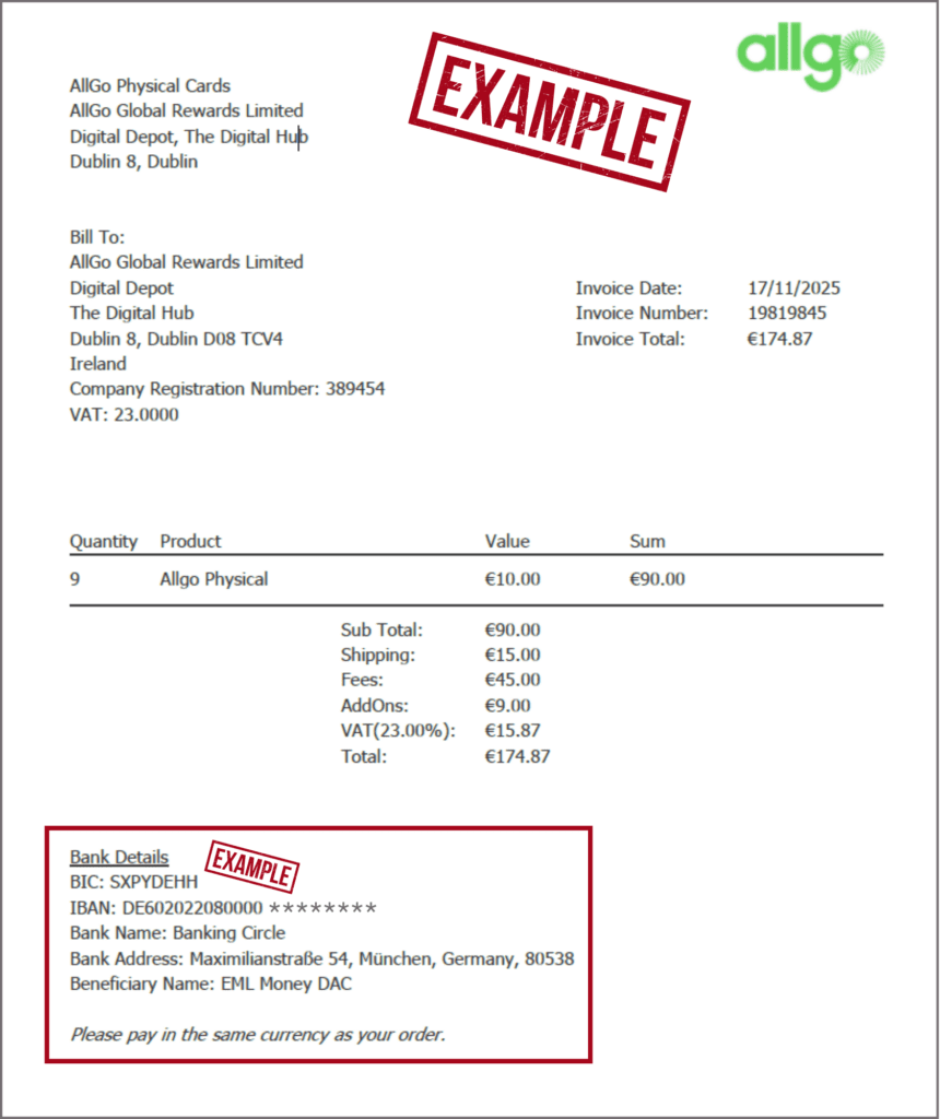- Make sure your are paying into the IBAN at the bottom of the invoice – it may be NEW or different from previous orders!